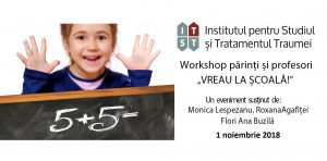 Realitatea actuala arata ca multi copii, parinti si profesori se confrunta cu refuzul scolar sau cu dificultati de adaptare ale copilului la acest mediu. De asemenea, pe parcursul traseului scolar al unui copil apar o serie de obstacole care ridica semne de intrebare, mai ales pentru adulti. Pentru a adresa aceasta problema, ne face placere sa va invitam la un nou eveniment marca ISTT: „Vreau la scoala!”, un workshop dedicat parintilor si profesorilor.